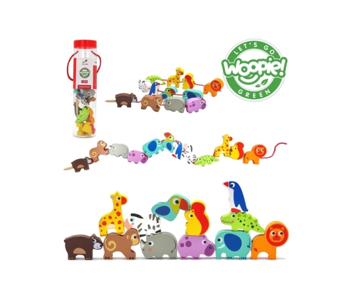 Klocki Koraliki Do Nawlekania Zwierzęta Safari ZOO od marki WOOPIE z serii GREEN to idealna zabawka do rozwijania umiejętności manualnych i nie tylko u dziecka. Przeplatanka dla dzieci utrzymana została w motywie ZOO Safari. Nawlekanka to klasyczny zestaw drewnianych klocków z dziurkami, przez które dziecko przeplata sznureczek. Jest to świetna zabawa, która pobudza obszary w mózgu i rozwija zdolności manualne tzw. "małą motorykę", koordynację ręka-oko, wspomaga koncentrację oraz wzbudza ciekawość dziecka na temat dzikiego świata zwierząt!