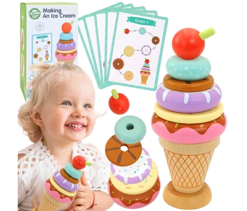 Lody Drewniane od marki WOOPIE GREEN to fascynująca i edukacyjna zabawka, idealna dla wszystkich dzieci. Zestaw składa się z 12 elementów, w tym 1 wafelka, 6 kolorowych gałek lodów oraz 5 kart z 10 różnymi wzorami lodów. Zabawa polega na tworzeniu lodów zgodnie ze wskazanym wzorem. Na każdej karcie ze wzorem loda, na górze są pokazane składniki, a na dole pokazany wygląd loda z boku. Dziecko wybiera potrzebne składniki, a następnie patrząc na grubość i kolor układa składniki zgodnie z kolejnością. Zabawę można urozmaicić o grę w zapamiętywanie i odtwarzanie z pamięci obrazka przez malucha. Można również zakryć na karcie składniki, a dziecko na podstawie samego wyglądu może dobrać potrzebne składniki i ułożyć hamburgera. Dziecko może również wymyślić swój własny wygląd - ogranicza tylko kreatywność i wyobraźnia. Dodatkowo dziecko podczas zabawy może wcielić się w prawdziwego kucharza (odgrywanie ról). Zabawka rozwija zdolności manualne, logiczne myślenie, wyobraźnie i kreatywność, koncentracje oraz zapamiętywanie