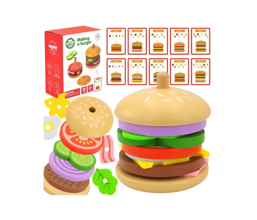 Drewniany Burger od marki WOOPIE z serii GREEN to ciekawa edukacyjna zabawka dla wszystkich dzieci. Zestaw zawiera 15 el.: w tym 2 bułki burgera, 8 składników burgera i 5 kart z 10 wzorami burgera. Zabawka polega na ułożeniu burgera zgodnie ze wzorem. Na każdej karcie ze wzorem burgera, na górze są pokazane składniki, a na dole pokazany wygląd burgera z boku. Dziecko wybiera potrzebne składniki, a następnie patrząc na grubość i kolor układa składniki zgodnie z kolejnością. Zabawę można urozmaicić o grę w zapamiętywanie i odtwarzanie z pamięci obrazka przez malucha. Można również zakryć na karcie składniki, a dziecko na podstawie samego wyglądu może dobrać potrzebne składniki i ułożyć hamburgera. Dziecko może również wymyślić swój własny wygląd burgera - ogranicza tylko kreatywność i wyobraźnia. Dodatkowo dziecko podczas zabawy może wcielić się w prawdziwego kucharza (odgrywanie ról). Zabawka rozwija zdolności manualne, logiczne myślenie, wyobraźnie i kreatywność, koncentracje oraz zapamiętywanie.