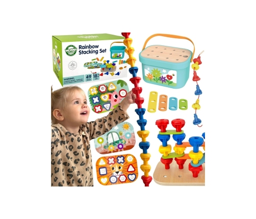 - - Umiejętności manualne "motoryczne" - Układanie kołeczków, budowanie konstrukcji oraz nawlekanie ich na sznurek to doskonałe ćwiczenie dla małych rączek, rozwijając precyzyjne ruchy oraz motorykę małą