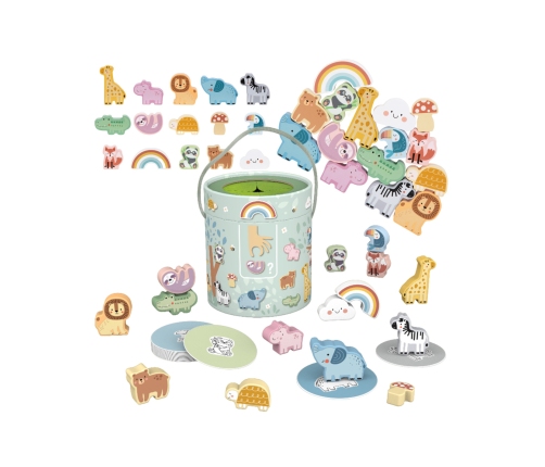 Tajemnicze Pudełko od Woopie to świetna wielofunkcyjna gra , która zapewni zabawę samodzielną oraz towarzyską. Gra zawiera 15 drewnianych figurek w tym zwierzątka, grzybka, tęczę oraz uroczą chmurkę, wszystkie ukryte w tajemniczym pudełku. Dzieci wybierają jedną z 15 kart, sięgając do pudełka, za pomocą dotyku mają odnaleźć wskazaną na obrazku figurę poznając jej kształt. Tajemnicze pudełko to oryginalna gra która cieszy się dużą popularnością. Rozwija u dzieci zmysł dotyku. ćwiczy motorykę małą oraz uwagę. Zestaw pozwala na wiele wariantów kreatywnych zabaw, np. dopasowanie w pary, naukę kolorów, nazw zwierząt oraz układanie w stos.