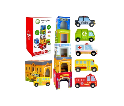 Układanka Miasto od marki WOOPIE z serii GREEN to doskonała alternatywa tradycyjnych układanek i klocków. Dzieci dzięki kolorowym, pełnych ilustracji kostkom z łatwością połączą naukę z zabawą. Dodatkowo zestaw zawiera drewniane pojazdy z gumowymi kółeczkami! Dziecko samo decyduje jaka konstrukcję zbuduje. Kostki są ilustrowane w logiczny sposób rozwijający percepcje dziecka np. na największej umieszczony jest numer 1, a na najmniejszej numer 5. Dziecko łatwo może nauczyć się liczb przez układanie wieży od największego do najmniejszego numeru. Pomaga w rozróżnianiu pojazdów i ważniejszych instytucji miasta jak np. straż, szkoła czy szpital. Na pudełka napisane są angielskie nazwy budynków, co może pomóc w nauce angielskiego w późniejszym etapie życia. Kostki mogą być dodatkowo wykorzystane jako miejsce na przechowywanie różnych przedmiotów, takich jak kredki czy też długopisy. Dziecko może zabawić się i wyobrazić sobie życie w mieście oraz pobudzić kreatywność wymyślając różne historie. Zabawka nie zawiera ostrych krawędzi i pomalowana jest nietoksycznymi farbami bezpiecznymi dla Twojego dziecka.