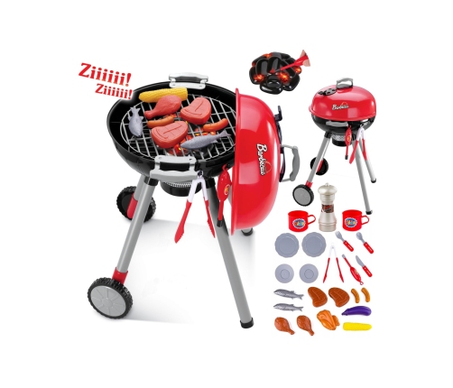 Grill Barbecue od WOOPIE jest jak prawdziwy grill! W zestawie posiada wszystko co potrzeba do zrobienia grilla: węgielki, zapalniczkę, szczypce, kiełbaski, steki, kurczaka, ryby i kukurydzę. Realistyczności dodają efekty świetlne i dźwiękowe. Funkcja prawdziwego rozpalania wystarczy zbliżyć zapalniczkę i słuchać charakterystyczny dźwięk oraz świecące na czerwono węgielki (moduł w każdej chwili można wyłączyć guzikiem). Zdejmowana pokrywa pozwala zabezpieczyć "gorący" ruszt po grillowaniu, a kółeczka i wygodny uchwyt pozwalają przewozić grill w dowolne miejsce ogrodu lub domu. dziecko będzie mogło wcielić się w ojca, który pilnuje rodzinnego grilla.