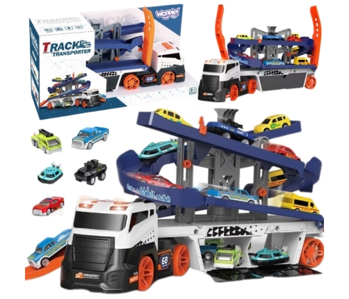 - Zabawka posiada dodatkowy parking na górze naczepy, z którego dzieci mogą rozpędzać autka i wyskakiwać nimi, co wprowadza do zabawy element dynamiki i zręczności.