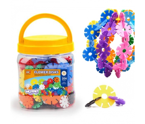 Klocki Konstrukcyjne Wafle od marki WOOPIE zwrócą uwagę i zafascynują Twoje dziecko. Kolorowe elementy przypominają wyglądem płatki śniegu. Klocki w bardzo łatwy sposób łączą się ze sobą, a ze względu na swoją budowę i sposób łączenia można z nich tworzyć ciekawe trójwymiarowe konstrukcje. Zastosowane otwory w śnieżynkach pozwalają na łączenie ich pod skosem, a nie tylko prostopadle. Zestaw zawiera 206 elementów zapakowanych w tubie. Samo budowanie konstrukcji rozwinie u dziecka logiczne myślenie, wyobraźnie, kreatywność oraz pomoże mu się skoncentrować podczas tworzenia . Przez układanie klocków dziecko poznaje kształty i kolory oraz ćwiczy zdolności manualne tzw. motorykę małą.