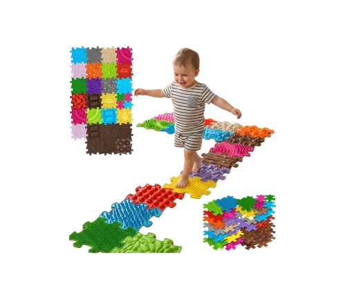 Mata sensoryczna rekomendowana przez markę Woopie o wspaniałych wartościach ortopedycznych jest niezbędna dla wsparcia rozwoju Twojego maluszka. Dodatkowo może być świetną zabawą dla dzieci, które uwielbiają chodzić boso. Zestaw posiada 26 elementów/puzzli + 4 mniejsze o różnego rodzaju strukturach twardych oraz miękkich, które doskonale się uzupełniają.