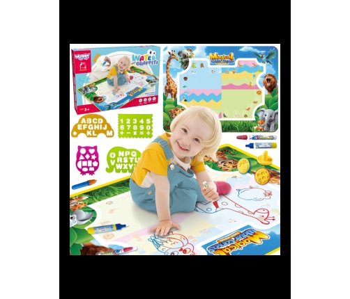 Mata do Malowania Wodą marki WOOPIE to edukacyjny zestaw artystyczny dla dzieci od 3 roku życia. Wystarczy napełnić dołączone pisaki/pędzelki czystą wodą, by odkrywać kolory, litery, liczby i kształty bez użycia tuszu i farb. Rysunki pojawiają się na chwilę, a po wyschnięciu znikają, zapraszając do kolejnej zabawy. Duży format 100×75 cm daje miejsce do wspólnego tworzenia, a wesoła grafika zwierząt z dżungli zachęca do nauki przez zabawę.