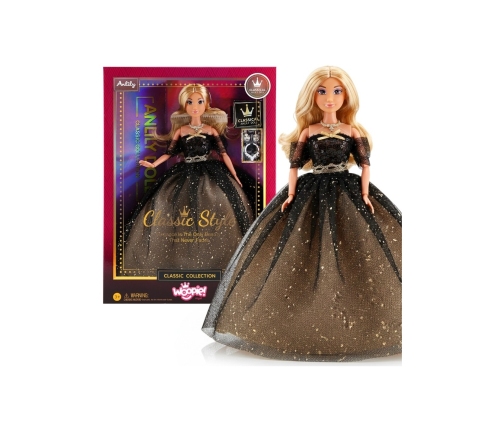 Lalka Lily marki Woopie to prawdziwa ikona stylu i elegancji! Zachwyca spektakularną wieczorową kreacją w odcieniach czerni i złota, ozdobioną tysiącami cekinów. Długie, złote włosy są idealne do tworzenia najpiękniejszych fryzur. Ta wyjątkowa lalka to inspiracja do zabawy w świat mody i eleganckich przyjęć.
