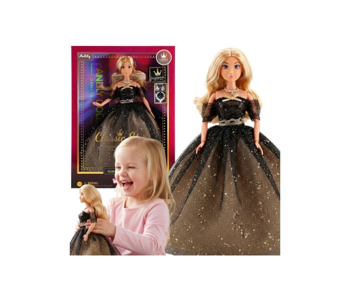 - - Lalka z długimi włosami w czarno-złotej eleganckiej sukni