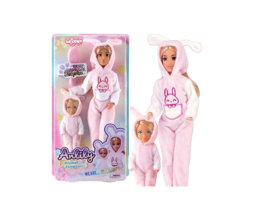 - - lalki ubrane w dopasowane różowe kombinezony króliczki