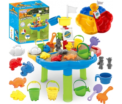 Stół Do Piasku od marki WOOPIE jest idealną zabawką do zabawy z wodą i piaskiem. Zestaw zawiera 13 akcesoriów: stolik z wyciąganymi nóżkami, foremki, wiaderka, konewkę, łopatkę i wiele innych. Stolik jest podzielony na trzy części, do jednej można wlać wodę, do drugiej wsypać piasek, a w trzeciej budować! Zestaw jest przeznaczony do zabawy w domu, jak i na zewnątrz. Idealne do zabawy w domu i na plaży lub w piaskownicy.