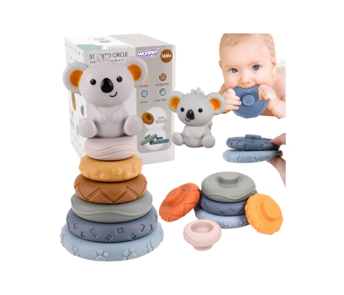 Uroczy zestaw do układania w stosy od marki WOOPIE, to pomysł na edukacyjny i bezpieczny prezent dla każdego malucha. Wykonana z elastycznego, miękkiego i nietoksycznego materiału, świetnie sprawdzi się także jako gryzak. Piramidka składa się z sześciu kółek w różnych rozmiarach, a na jej szczycie znajduje się śliczna koala. Jest to również zabawka sensoryczna - każda część piramidki ma swój unikalny wzór, wypukły lub wklęsły. Dodaje to dodatkowych wrażeń i efektów zabawie. Dodatkowo, dziecko może układać stosy według własnej wyobraźni lub sugerując się rozmiarem okręgów. Każdy element skonstruowany jest w taki sposób, że po złożeniu piramidka trzyma się stabilnie, co ułatwia przechowywanie i zabawę.