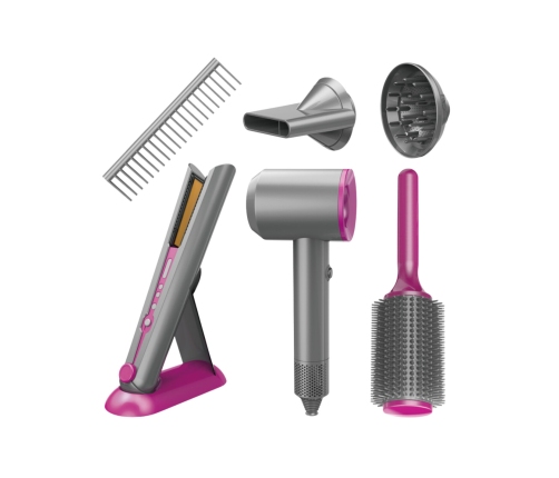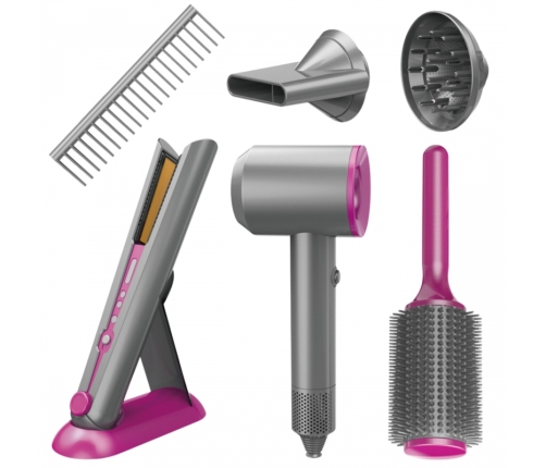 - - w zestawie: zabawkowa suszarka do włosów, nasadki, szczotka, grzebień do rozczesywania, itp.