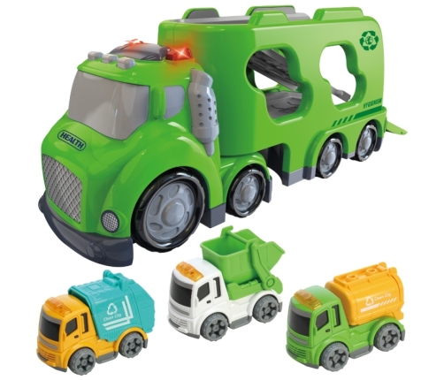 Laweta Sanitation Truck z serii CITY TRUCK to idealna zabawka dla każdego małego fana motoryzacji i miejskich pojazdów specjalnych. W skład zestawu wchodzi zielona laweta przewożąca małe pojazdy utylizacyjne. Zabawka została wykonana z trwałego tworzywa sztucznego, wyposażona w efekty świetlne i dźwiękowe, które aktywują się po naciśnięciu przycisku na dachu pojazdu.