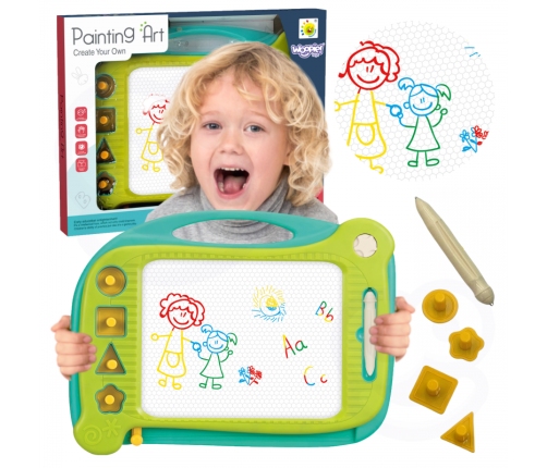 Znikopis Tablica Magnetyczna daje możliwość kreatywnej zabawy na długi czas! Tablica zachęca do pisania i rysowania. Rysowanie pozwoli skoncentrować, wyciszyć i uspokoić Twoje dziecko. Znikopis pozwala na tworzenie nieskończonej ilość obrazków – wystarczy przejechać specjalnym suwakiem, a rysunek zniknie i można rysować od nowa! Zestaw dodatkowo zawiera wygodny magiczny długopis oraz 4 stempelki, które urozmaicą dzieło. Tablica posiada wygodny uchwyt, dzięki czemu dziecko może zabrać ją wszędzie. Znikopis rozwinie u dziecka zdolności manualne, wyobraźnie, kreatywność oraz da szansę na rozwinięcie artystycznej strony dziecka!