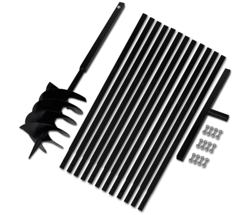 - Komplektā ir iekļauts zemes urbis, rokturis, 12 pagarinājumu caurules un dažas skrūves