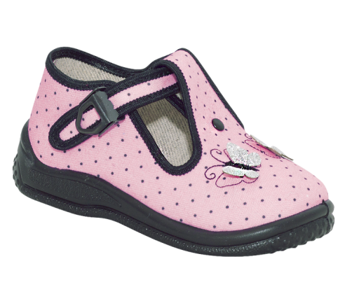 Obuwie dziecięce zapinane na klamerkę w modnym kolorze. Wnętrze buta wykonane z naturalnej tkaniny bawełnianej. Usztywniana piętka. Elastyczna podeszwa wykonana z bezftalanowego tworzywa. Buty ozdobione kolorowym haftem. Wkładka wykonana z naturalnej skóry oraz elastycznej pianki. Pianka zawiera węgiel aktywny. Skóra absorbuje nadmiar wilgoci a węgiel aktywny pochłania nieprzyjemne zapachy zapewniając stopie uczucie świeżości.