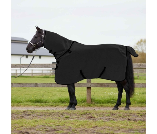 - Materiāla detaļas: Šis segums ir izgatavots no izturīga poliestera, kas nodrošina lielisku izturību pret nelabvēlīgiem laikapstākļiem. Samtainā tekstūra piešķir greznu sajūtu un komfortu, lai zirgs paliktu silts bez kairinājuma.