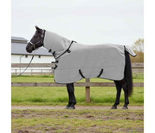 - Materiāla detaļas: Šis segums ir izgatavots no izturīga poliestera, kas nodrošina lielisku izturību pret nelabvēlīgiem laikapstākļiem. Samtainā tekstūra piešķir greznu sajūtu un komfortu, lai zirgs paliktu silts bez kairinājuma.