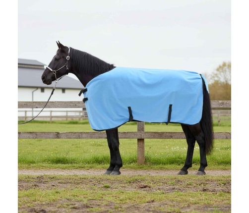 - Materiāla detaļas: Šis segums ir izgatavots no izturīga poliestera, kas nodrošina lielisku izturību pret nelabvēlīgiem laikapstākļiem. Samtainā tekstūra piešķir greznu sajūtu un komfortu, lai zirgs paliktu silts bez kairinājuma.