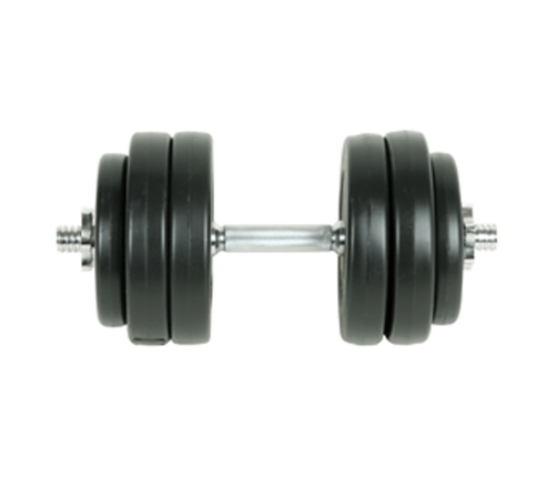 Hanteles kopējais svars ir 15 kg. Komplektā iekļautie svaru diski ir svarā no 1,25 kg līdz pat 2,5 kg. Pateicoties noņemamiem svaru diskiem, Jums būs iespēja regulēt sev piemērotāko vingrinājumu līmeni. Roktura struktūra nodrošinās maksimālu saķeri ar plaukstu, lai tas stingri iegultos Jūsu plaukstā. Hanteles galos atrodas bultskrūves zvaigznes formā, lai nodrošinātu, ka svaru diski vienmēr atrodas stingri un droši uz stieņa. Šis hanteļu komplekts ir viegli lietojams kombinācijā arī ar citām mūsu hantelēm, svaru diskiem un svarcelšanas soliem.
