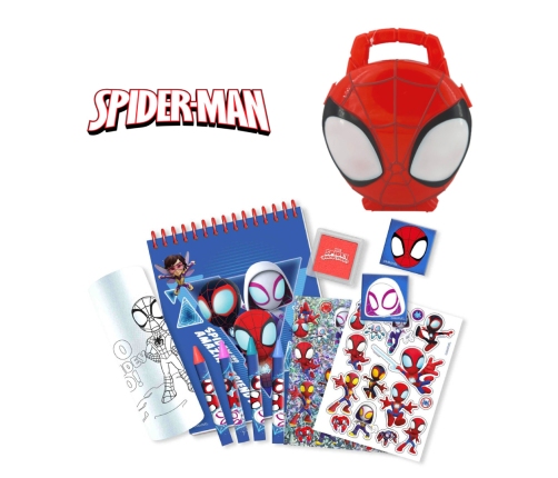 3D box with a handle featuring the image of Spiderman Roll of paper with characters to color Mini spiral notebook 3 stamps 4 colored pencils Sticker sets - 2 sheets