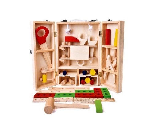 Drewniana skrzynka z narzędziami dla każdego małego majsterkowicza. W zestawie znajdziemy estetyczne elementy, specjalnie przygotowane dla dzieci. Dziecko stworzy z nim różne budowle według upodobania. Świetna zabawa gwarantowana.