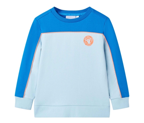 Šim bērnu džemperim ir garas piedurknes, apaļš kakla izgriezums un rievotas roku aproces, kakla izgriezums un apakšdaļa. Šim bērnu džemperim ir skaisti krāsu bloki un neona oranža apdruka uz krūtīm. Džemperis ir izgatavots no 100%, tāpēc tas būs ērts un elpojošs.
