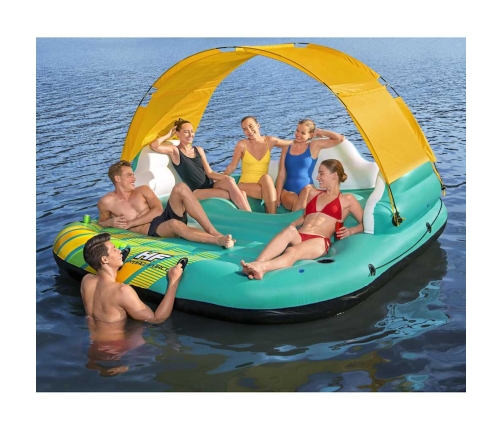 Šajā ietilpīgajā peldmatracī, kura maksimālā slogojamība ir 450 kg, var sasēsties līdz 5 personām. Matrača vidū ir sietveida zona, kurā jūs varēsiet iegremdēt pēdas. Noņemamā saulessarga nojume nodrošinās ēnu karstās vasaras dienās un aizturēs lielāko daļu kaitīgā starojuma. Matracī ir 5 dzērienu turētāji dzērienu un uzkodu turēšanai. Lai uzkāpšana uz matrača būtu ērtāka, tam ir 2 stingri rokturi. Trīs atzveltnes atpūtas laikā nodrošinās papildu atbalstu un komfortu.