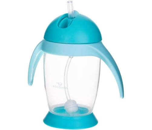 Kubek z silikonową rurką z odważnikiem umożliwia picie z kubka pod każdym kątem. Ruchoma część nakrętki pozwala łatwo i wygodnie schować rurkę, zapobiegając niekontrolowanemu wylaniu się napoju oraz zabrudzeniu. Wygodne uchwyty ułatwiają dziecku trzymanie kubka. Sprawdza się w podróży czy na spacerze.