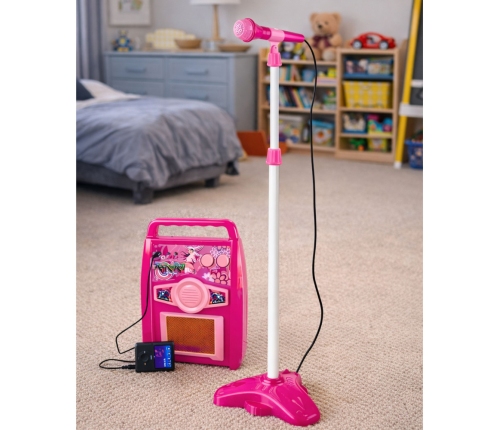 The included tripod makes it easy to mount the microphone in front of the kid. You can easily adjust its height, which can reach from 65 cm to 109 cm. The toy microphone, when connected to the guitar, transmits the child's vocals to the built-in speaker, from which they then resound. The amplifier, just like the guitar, has a built-in volume control, as well as three different ports: for the microphone, guitar and MP3 player.
