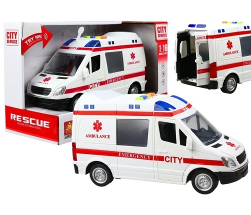 Autko-ambulans to rewelacyjna zabawka, która uzupełni kolekcję pojazdów Twojego malucha, równocześnie dostarczając mu ogrom radości płynącej z tej ciekawej zabawy. Samochodzik posiada widowiskowe efekty dźwiękowe i świetlne, charakterystyczne dla wozów pogotowia ratunkowego, a także otwierane drzwi i ruchome koła. Ta zabawka to również świetna propozycja prezentu dla małych przyszłych ratowników medycznych lub lekarzy.