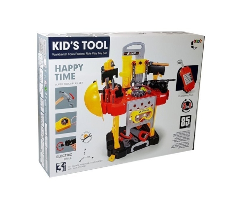 Zestaw składa się z 85 elementów. Dużej konstrukcji stolik z wieszaczkami pomieści przeróżne narzędzia i akcesoria. Kolorystyka czerwono-żółta wpasuje się do każdego otoczenia. W skład zestawu wchodzi elektryczna wiertarka. Dodatkową zaletą jest możliwość przerobienia walizki ręczne w walizkę na kółkach do ciągnięcia.