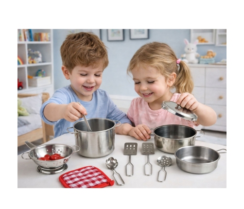 Our set of metal pots and kitchen accessories is the perfect toy for little cooks. In the set you will find everything you need to play out great scenes of culinary creativity.