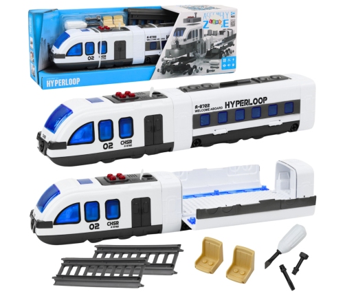 The train is in classic white with gray elements, which gives it a stylish and realistic look. It is equipped with sound and light effects that further enrich the fun. There are four red buttons on the roof of the train, each of them is responsible for a different sound, such as the departure signal, the clatter of wheels or the sound of the train in motion.