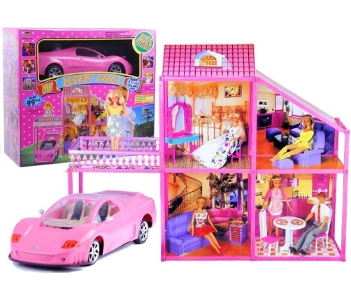 Zestaw domku dla lalek z akcesoriami osiąga imponujący rozmiar — rozłożony osiąga około 76 cm, co na pewno zaskoczy każdą właścicielkę posiadłości. Co więcej, do zestawu dołączone są mebelki służące do wyposażenia pokoi oraz niespodzianka — dwuosobowe, sportowe auto w różowym kolorze. Dwupiętrowy dom dla laleczek składa się z czterech pokoi, tarasu z ochronnymi barierkami oraz otwartego garażu. Wnętrze pokoi dla mieszkańców tego domu jest bardzo kolorowe, wzorowane na klasycznych, znanych dzieciom mieszkaniach. Dziewczynka może bawić się lalkami do 29 cm w znajdujących się na parterze kuchni i salonie oraz na piętrze w sypialni, pokoju dziennym i tarasie.