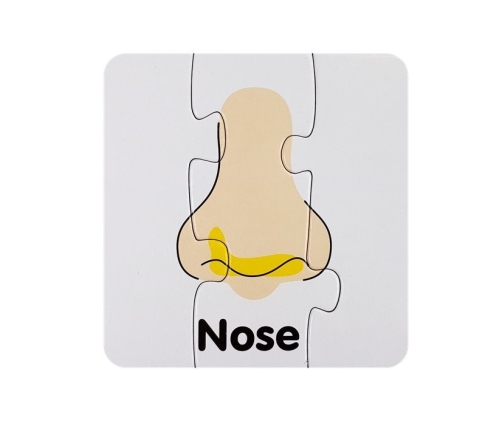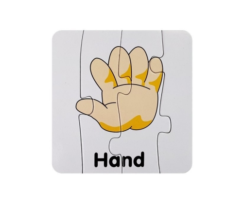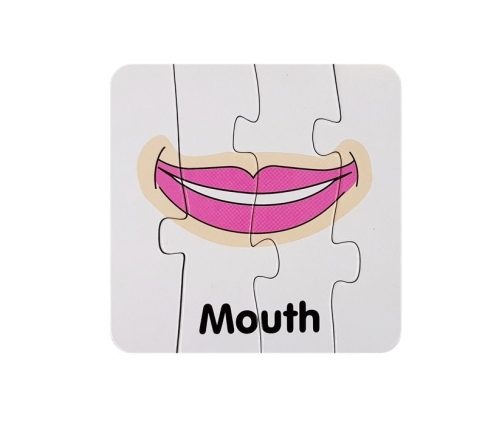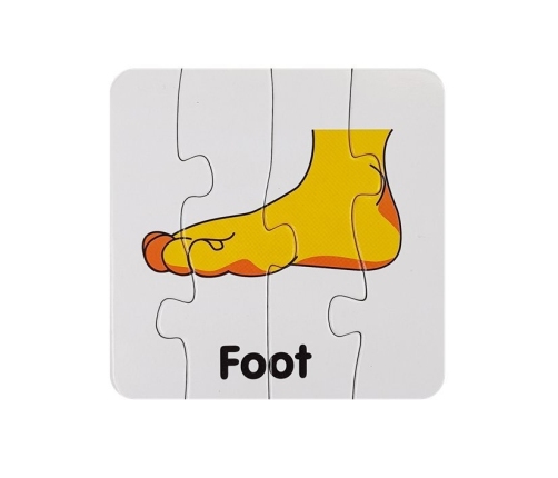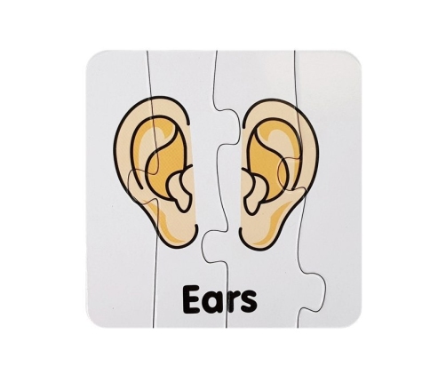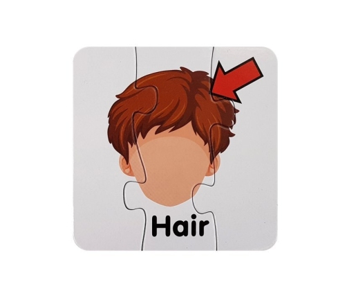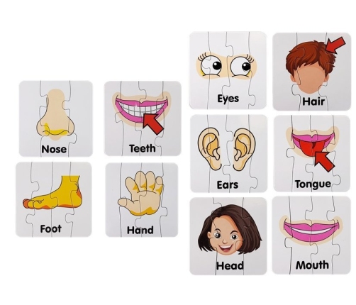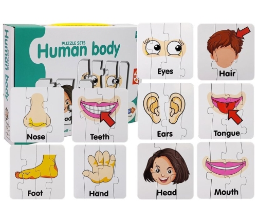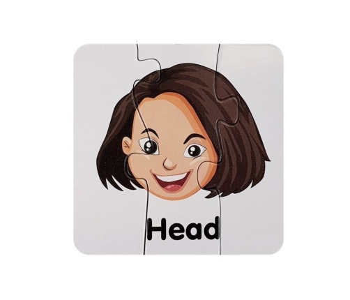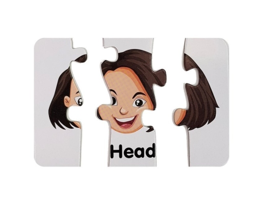 Łamigłówki edukacyjne będą dobrym ćwiczeniem dla wyobraźni, poszerzą wiedzę oraz ćwiczą cierpliwość. Całość będzie procentować w przyszłości u dziecka. Poprzez dopasowanie kształtów puzzli dowie się jak nazywają się poszczególne części ciała, nauczy się dopasowywać kształty. Każda z części ciała ma podpis w języku angielskim, dzięki czemu pozna podstawowe słówka. Z wszystkich puzzli można stworzyć aż 10 połączeń. Po ułożeniu ukażą się obrazki takie jak: głowa, oczy, usta, nos.