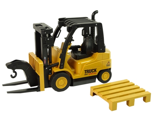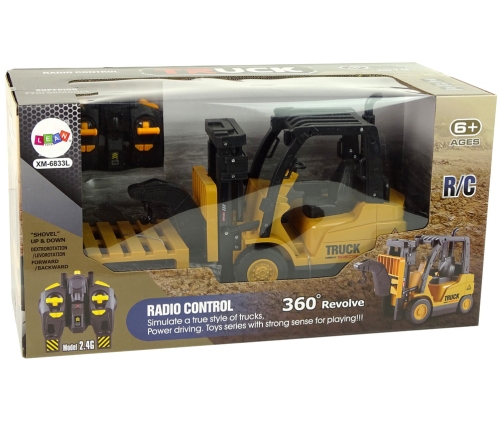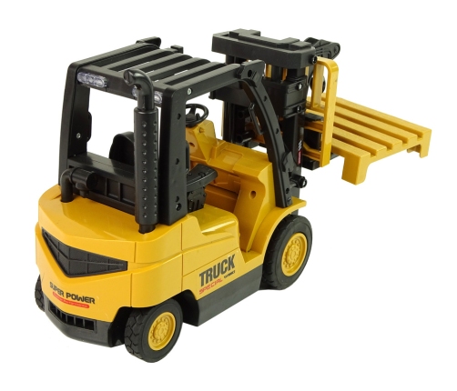 The trolley is maintained in yellow and black colours, this colour scheme is associated with vehicles on construction sites. Despite its small size, the toy has many details, which further enhances the play experience. On the dashboard you can find the steering wheel and many grooves simulating the indicators, the gear stick found here in a full-size car. Looking at the toy truck you will definitely notice the open operator's cabin. With the remote control you can steer the forklift, this will also enable you to increase your precision and manual skills.