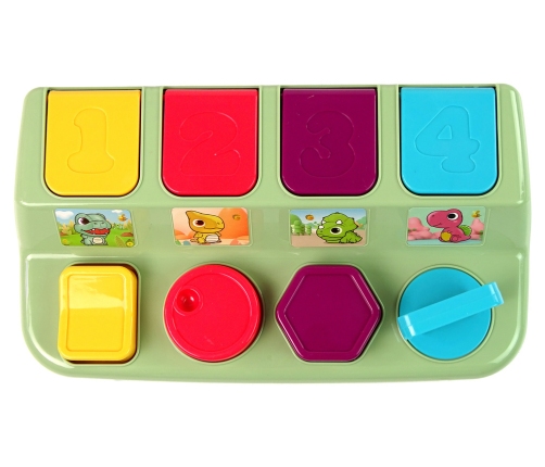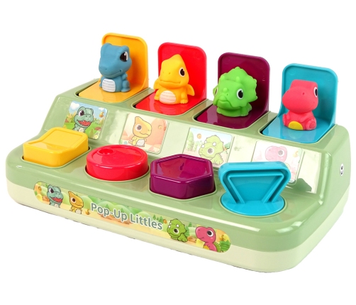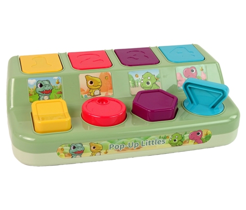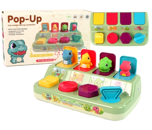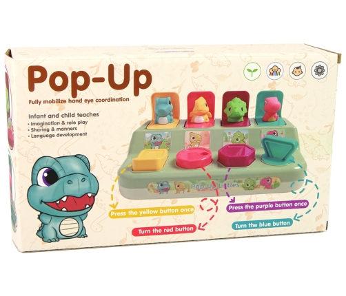 A pop-up toddler dexterity toy that supports both manual and visual dexterity. The child learns and plays at the same time. The toy, after pressing or turning a particular shape, allows different dinosaurs to appear. This allows introducing children to the world of nature while learning perceptiveness.