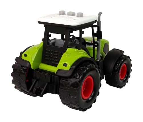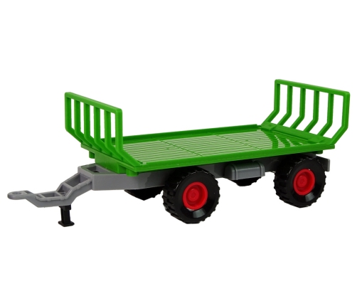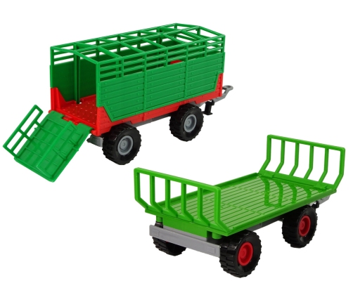 The toy is mainly dominated by the green color, which we associate with this kind of vehicles. The set includes a tractor and two types of trailers, which will add variety to the child's play. The tractor itself has the option of driving and making distinctive sounds. The rear wheels, through hand propulsion, allow the vehicle to move forward or backward, depending on your preference. As for audible sounds, on the other hand, the tractor has 3 buttons visible on the roof. These buttons produce sounds such as reversing, honking and starting. To hear the sounds in question, pull out the white plastic lock. The tractor in its set has two different types of trailers, which should be attached to the back of the vehicle depending on which trailer the child wants to play with.