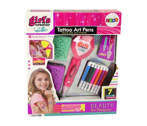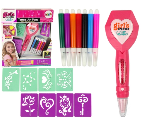 The electronic pen behaves like a tattoo machine, with its help we can make colourful tattoos on the skin. Special pens included in the set will be suitable for this. The set includes 8 fashionable stencils. Just choose the stencil, the colour of the nib and you can start creating the tattoo. Great fun bringing a smile to your face.