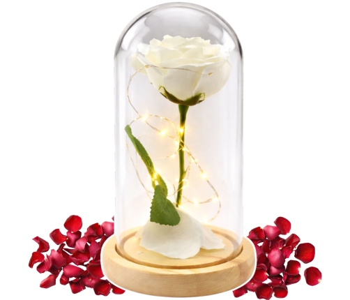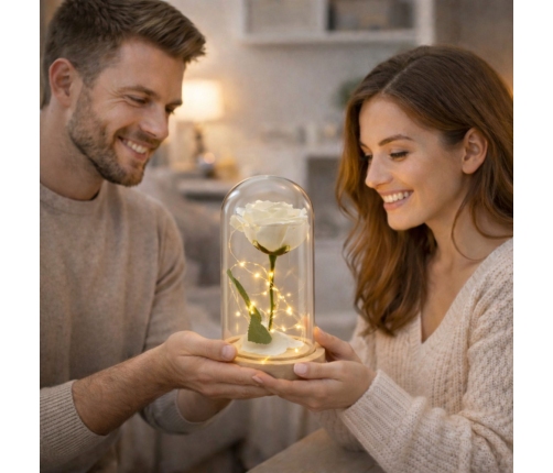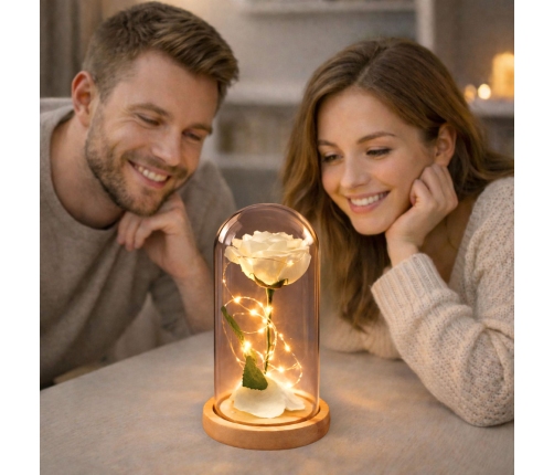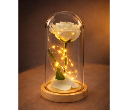 The Eternal White Rose in a Glass Dome with LED Lighting is the perfect gift for those who appreciate elegance and symbolism. This artificial rose, meticulously designed to resemble a natural flower, never fades and always looks fresh. Encased in a glass dome and illuminated by soft LED lights, it creates a romantic atmosphere, perfect for special moments.
