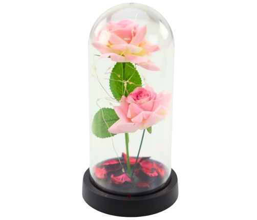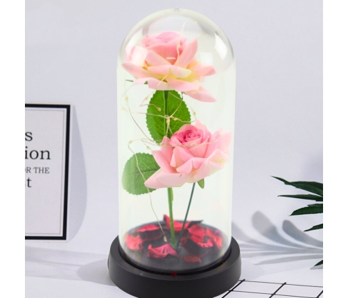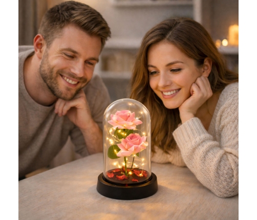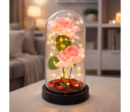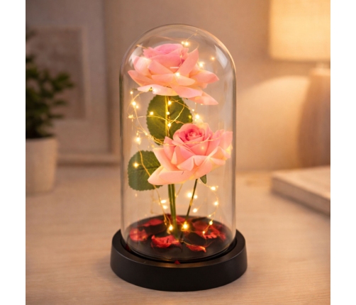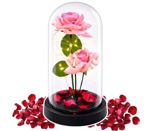 ⭐ Eternal Roses in a Dome with LED Lighting and Rose Petals - Pink ⭐ Eternal roses in a dome with LED lighting are an elegant and symbolic gift that expresses your feelings and adds a unique touch to any interior. Inside the dome, there are two artificial roses, and floating rose petals create a magical atmosphere when combined with the subtle LED light, making it perfect for romantic occasions.