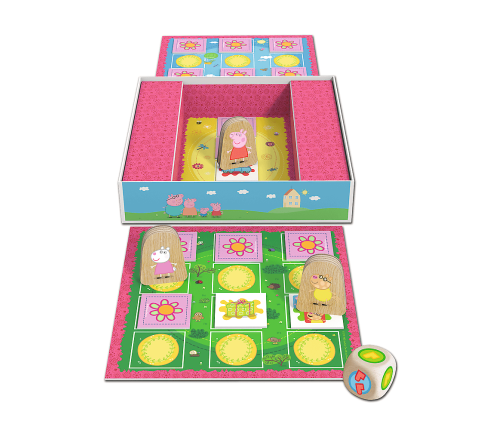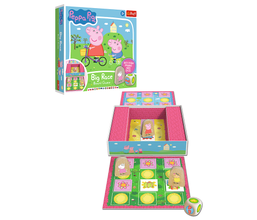 Trefl, Big Race – The Great Peppa Pig Race, a family board game for children aged 3 and up Big Race is a board game for the youngest, which will delight all fans of the Peppa Pig cartoon! It is intended for children aged 3 and over and is an ideal proposition to start an adventure with board games! Experience your first victories and defeats together with your favorite Peppa Pig characters. It's time to start the big race! Throw the wooden dice and traverse the board full of surprises. During the game, players move their chosen pawns. But watch out! There are tiles on the board, under which instructions are hidden! You can gain an additional move with the dice, swap pawns, move forward or go back one square. Remember, there is only one task, you have to leave the board as soon as possible! Race time, start! Colorful illustrations attract attention, and simple rules of the game encourage toddlers to play. The large, wooden cube is safe for children and fits perfectly into little hands. Peppa Pig characters invite you to play together! Game features: • Family game for the youngest • simple rules • wooden pawns and a cube • Ideal for children from 3 years of age The game develops: • Logical thinking skills • The ability to compete in a healthy way Get to know Trefl Games with Babies and Teddy Bear and share the joy of the game. Games for the youngest are a great gift for a birthday, Children's Day or under the Christmas tree. They will be great during moments spent with the family. Box contents: • 2 boards • 16 tiles • 3 wooden pawns • wooden dice • instructions Box dimensions: 245x245x53 Number of players: 2-3 Average game time: 15-20 min Age: 3+