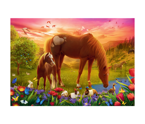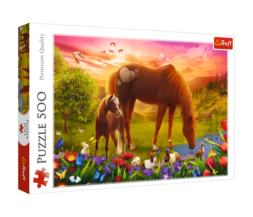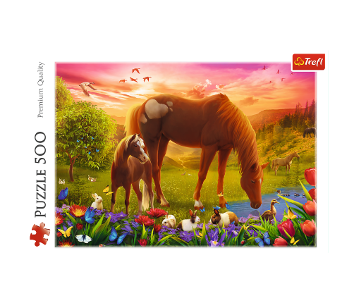 A 500-piece puzzle depicting grazing horses at sunset.