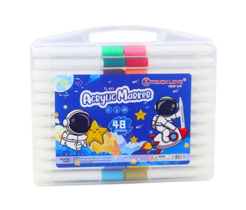 A set of acrylic markers is a perfect tool for every young artist and art enthusiast. High-quality markers in 48 intense colors allow you to create unique artistic and decorative projects. Thanks to the acrylic ink formula, the colors are resistant to fading and abrasion, and also perfectly cover various surfaces, such as paper, cardboard, wood, plastic or glass. Their exceptional pigmentation makes each drawing expressive and full of colors, making them ideal for both everyday sketches and professional artistic works.