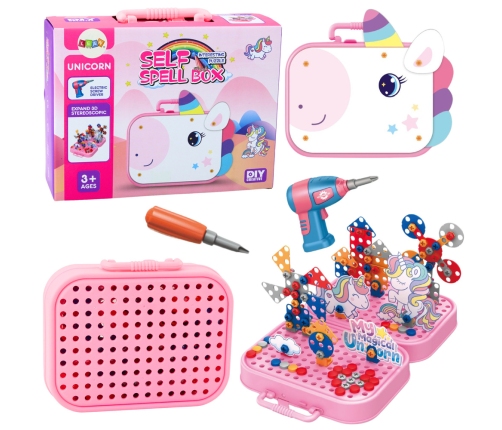 The creative construction set in a suitcase is an educational toy that stimulates imagination, develops manual skills and supports learning logical thinking and concentration. Thanks to the included, safe to use, battery-powered screwdriver, children can independently create various three-dimensional structures from colored screws and assembly elements. The process of screwing and designing develops precision of movements, patience and perseverance. The unicorn motif, pastel colors and aesthetic, lockable packaging make the set exceptionally visually attractive and child-friendly.