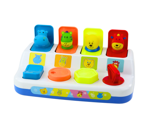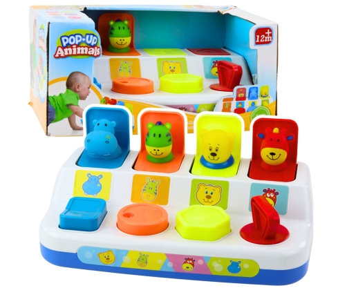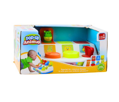 A colorful and interactive pop up game with popping animals is a great toy for the youngest children. The toy involves pressing, twisting and pressing buttons that match the colors to activate the mechanism that opens the window and makes the animal jump out. The set includes four charming characters: a hippopotamus, a zebra, a teddy bear and a cow.