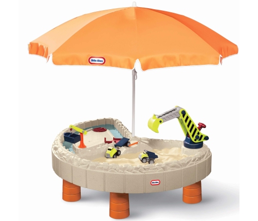 - -w zestawie znajduje się parasol, który osłoni maluchy przed ostrym słońcem i dwa autka budowlane do wspaniałej zabawy