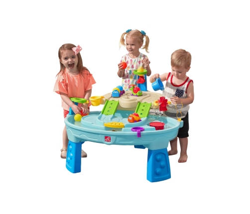 Dwupiętrowy stół dla dzieci Step2 Ball Buddies Adventure Center! Oprócz klasycznej wywrotki Ball Buddies, ten stół do zabawy na zewnątrz dla dzieci zawiera helikopter Ball Buddies, łódź i pociąg - które mogą przewozić dwie piłki do zabawy w tym samym czasie! Ball Buddies nie mogą się doczekać przygody wokół rzeki lub rejsu po zakrętach odlewanych dróg i mostów. Dzięki dużemu obszarowi, wielu dołączonym akcesoriom i wielu sposobom zabawy, ten dziecięcy stół wodny jest doskonałą opcją do zaangażowania się w zabawę społeczną dla wielu dzieci. Ponadto poszczególne stacje wokół basenu oferują dodatkowe opcje dla najmłodszych, którzy chcą bawić się sami. Mali poszukiwacze przygód mogą używać obręczy do rzucania piłek do wody i cieszyć się ekscytującą zabawą wodną za pomocą koła wodnego i dołączonych miarek. Na dnie znajduje się nawet interaktywne koło, dzięki czemu maluchy mogą wprawić wodę w ruch i stworzyć płynącą rzekę.